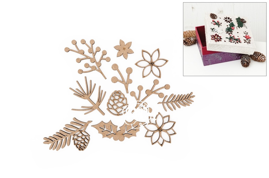 Kit surtido de silueta de madera D.m. 3 mm. cortado a laser, medidas entre 3 y 7 cm. Piñas, hojas, acebo, flores.